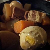 - 4 余分な脂を取り除いた1のフライパンに(A)、水を入れて混ぜ、赤みそが溶けたら3、ゆで卵、2を入れます。