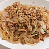 - 3 フライパンに(A)、ニンニクを入れて中火で熱します。ニンニクが香ってきたらアスパラガスを入れます。軽く焦げ目がついたらくるみ、パセリ、(B)、玉ねぎを入れて弱火で8分加熱します。
