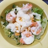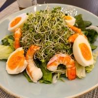 ブロッコリースプラウトをたっぷり使ったサラダのレシピです。エビやゆで卵で食べ応えも抜群です。市販のドレッシングでもお召し上がり頂けますが、とても簡単なのでシーザードレッシングも手作りしてみてくださいね。