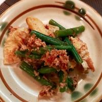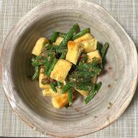いんげんを、さっと茹でて、カリッと焼いた油揚げと共にマヨネーズとポン酢で混ぜ合わせました。カリッと、サクサクとした食感がアクセントとなり、とてもおいしいですよ。夜ごはんの、副菜の一品にしてみてはいかがでしょうか。