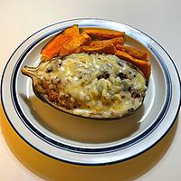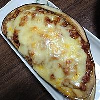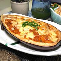 周りを1周包丁で切り込みを入れてからスプーンでえぐりだしました♪ミートソースは以前作って残ったのを冷凍してあったのでそれを使用。中身は柔らかく美味しかったけど器になっている茄子は若干固め。食べるときは包丁でカットしての方が食べやすかったです。