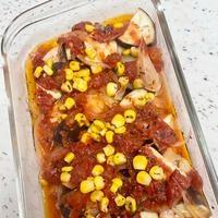 - 4 耐熱皿に3、2、2、カットトマト缶、コーン、調味料の材料を入れ、ひと混ぜしてラップをし600Wの電子レンジで10分加熱します。