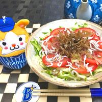 - 2 ミニトマトを1/4、きゅうりとみょうがを千切りに切ります。