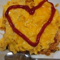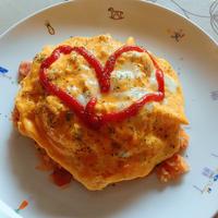 - 6 器に3、5を盛り付け、ケチャップをかけて完成です。