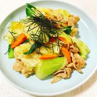 - 8 同じフライパンにごま油をひき、中火で熱し4を入れて炒めます。豚バラ肉に火が入ったら5、7を入れて中火のまま炒めます。