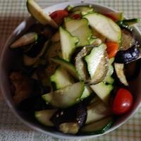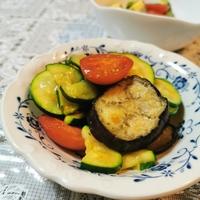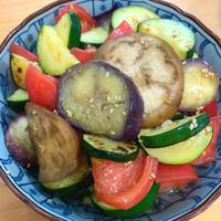 ナス、ズッキーニ各1本、トマト1.5個使用。ラー油無し、ゆずぽん使用。ナスもズッキーニもオリーブオイルで炒めました。見た目も味も夏らしくて良いです!旦那からも好評でした。