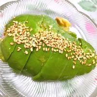- 2 アボカドを取り出し、1cm幅に切り、器に盛りつけて白いりごまを散らしたら出来上がりです。
