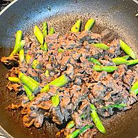 - 2 中火で熱したフライパンにごま油をひき、牛こま切れ肉を入れて炒めます。