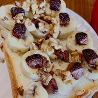 トーストした上にチョコソース・ナッツ・バナナをのせていますが、のせてからトーストも美味しそうですね。