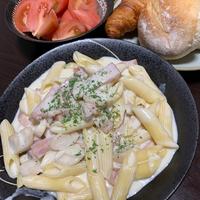 シチューの素を使い、さらに牛乳だけではなく生クリームも使用することで、通常のクリームソースよりも濃厚でコクのある仕上がりになりました。 きのことベーコンは炒めずにレンジ加熱することで調理時間を短縮しています。