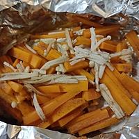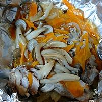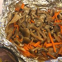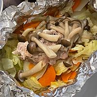 - 4 アルミホイルにサラダ油をひき、玉ねぎ、豚肉、にんじん、しめじの順で並べます。