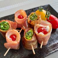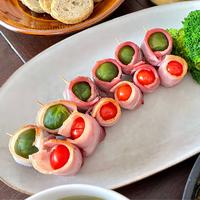 - 4 芽キャベツとトマトに2と3を巻きながら竹串に刺します。