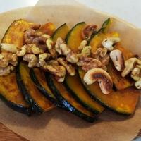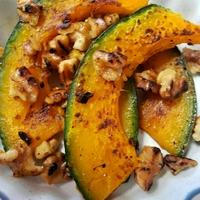 かぼちゃとくるみをフライパンで焼いて作る、焼きかぼちゃのサラダです。焼いたかぼちゃは、甘くてホクホク。シンプルな調味料で和えた簡単なレシピですが、かぼちゃの甘みとお酢の酸味が程よいバランスで、とってもおいしいですよ!