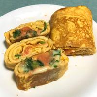 - 4 奥から手前に巻き、奥に戻します。残りの2の半量を入れ、全体に広げて中火で熱し、奥から手前に巻き、奥に戻します。同じようにもう1度くり返します。