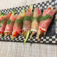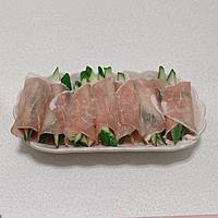 - 6 生ハムの上に1、2、3をのせて巻きます。同様に7個作ります。