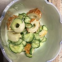 - 2 きゅうりは薄切りにし、塩をまぶして5分ほど置き、水気を絞ります