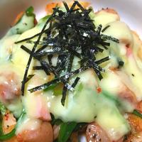 - 6 オーブントースターに入れ、ピザ用チーズが溶けるまで5分程焼き、のりを散らして出来上がりです。
