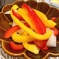 - 1 大根は拍子切りにします。赤パプリカと黄パプリカは半分に切ってとヘタを取り除き、細切りにします。