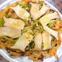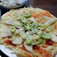 - 4 更に5分焼き、2の長ねぎ、塩こしょう、エリンギ、オリーブオイル、パルメザンの順に乗せます。