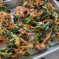 空心菜と玉ねぎのかき揚げはいかがでしょうか。油と相性がよい空心菜を、甘みがある玉ねぎやにんじん、旨みたっぷりの桜えびを一緒に揚げることで、彩りよいかき揚げに仕上がりました。天丼や天ぷらそば、天ぷらうどんにするのもオススメです。ぜひお試しください。