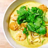 桜えびでエビの風味を出した、ラクサ風のご紹介です。ココナッツミルクパウダーの優しい甘味と、桜えび、カレー粉の風味が鶏もも肉のコクとうま味によく合い、中華麺によく絡んでついついお箸が止まらなくなりますよ。ぜひ、お試しくださいね。