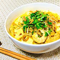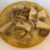 お店で食べるラクサに近い仕上がりでとても美味しかったです。桜海老の代わりに戻した干し海老使用、もも肉の代わりにむね肉使用、豆もやし多め、ココナッツミルクに水を加えて作りました。隠し味でガピを基にして作った調味オイルを追加してます。中華麺ではなく米麺使用しています。