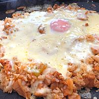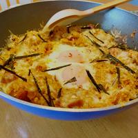 - 8 全体に味がなじんだらごはんをならし、中央にくぼみを作り、卵を入れます。周りにピザ用チーズを散らし、蓋をして加熱します。
