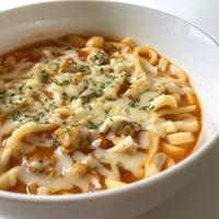 洋風カレースープがおいしいカレーうどんのご紹介です。カットトマトとカレー粉、チリパウダーのスパイシーなお味が鶏もも肉のコクによく合い、うどんに絡んでついついお箸が止まらなくなるおいしさですよ。ランチやお夜食にも喜ばれますのでぜひ、お試しくださいね。