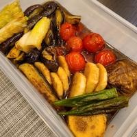 アスパラはありませんが、だし汁が最高なので色んな焼き野菜を浸けるのにいいです! 今回は、ナス、長芋、ミニトマト、オクラ、長ネギで作りました。