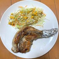 骨付き鶏もも肉をジューシーに焼き上げた一品です。骨付き鶏もも肉はオーブンでローストするのがおなじみですが、丁寧に厚さを均一にすればフライパンでもおいしく焼けますよ。丸亀のご当地グルメをイメージして、キャベツを合わせて召し上がってもおいしいですよ。