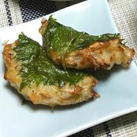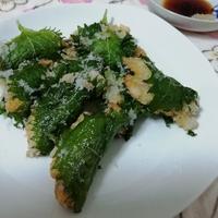 片栗粉では大葉がはがれてしまう可能性があるので、水溶き片栗粉で揚げています。