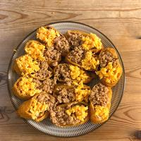そぼろ丼をどんぶりではなく、お稲荷さんの皮を器にして仕上げました。優しい味付けの鶏そぼろと、甘じょっぱいしかっりとした味付けのお稲荷さんの皮がとても良く合います。 お弁当にも良いですね。ぜひ作ってみてくださいね。