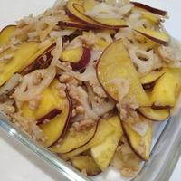 - 1 さつまいもは皮付きのまま薄い半月切りにします。