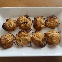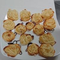 焦げました!うちのオーブンでは15分くらいがちょうど良かったです(^^)味は甘すぎず、子供たちのオヤツにピッタリだと思いました!箸でクルクルまとめるのに時間がかかりフォークでクルクルした方が早く綺麗にできると思います(^^)/