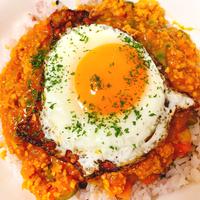 - 5 ごはんを盛り付けたお皿に4をかけて温泉卵をのせ、パセリを散らして完成です。