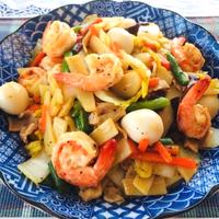 - 5 豚バラ肉の色が変わったら2、エビ、きくらげを入れて中火で炒めます。