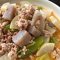 たべれぽでひき肉が食べにくいとのことだったので、片栗粉でとろみを付けました。大根とひき肉がしっかり絡んで食べやすく美味しかったです。豆板醤は多めに入れても良いかも。
