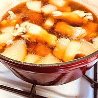 - 6 薄く焼き色がついたら2、3、煮汁の材料、4を入れて中火で加熱し、沸騰したら弱火にして10分程煮ます。具材に火が通ったら火から下ろします。