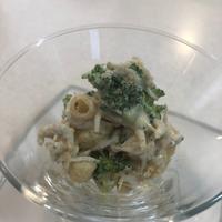 - 1 ブロッコリーは小房にわけます。耐熱ボウルに入れ、水を加え、ふんわりとラップをし、500wの電子レンジで1分程加熱します。柔らかくなったら、水気を切り、粗熱をとります。