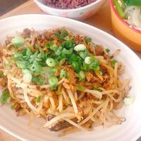 - 4 もやし、(A)を加えて炒め、全体に味がなじみ、もやしがしんなりしたら火から下ろします。