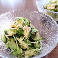 - 1 両端のヘタを切り落としたきゅうりをスライサーでスライスし、塩もみし5分ほど置いておきます。 乾燥わかめを水に浸して戻します。 かいわれ大根は根元を切り落とし、水でよく洗います。