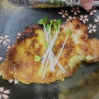 厚めの豚ロースを薄くなるまで叩いて、とんかつのように衣をつけて、油で揚げ焼きにしたカツレツのご紹介です。薄く叩いているので、噛みやすく食べやすいです。粉チーズの他にカレー粉を足してしっかり味もついているので、そのままでお召し上がりいただけます。