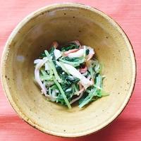 - 1 三つ葉は5cm幅に切り、耐熱ボウルに入れます。ラップをかけ600Wの電子レンジで1分程加熱し粗熱が取れたら水気を切ります。