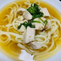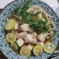 - 9 器にうどん、だし、鶏肉、大葉、カボスの順にのせて白いりごまを振りかけたら完成です。