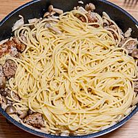 - 7 5を弱火にし、6のスパゲティを加えて混ぜます。6のゆで汁かお湯を加えて塩分とかたさを調整し、粉チーズを加えて混ぜます。