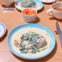 鶏むね肉には薄力粉を塗して焼きました。舞茸の代わりにほうれん草を。濃厚チーズのソースがとっても美味しかったです!