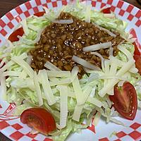 ひき肉の代わりに納豆を使用したタコライス風のレシピです。 加熱なしで調味料と混ぜるだけのタコミート風の納豆を、野菜と一緒にごはんにのせていただきます。 味付けはお家にある調味料でできますね。 お手軽さと節約のお役立ちの一品です。