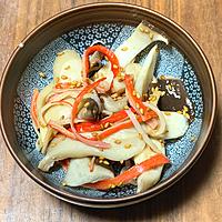 - 1 エリンギは半分に切り、5mm幅の斜め切りにし、耐熱ボウルに入れラップをし、600Wの電子レンジでしんなりするまで3分加熱します。