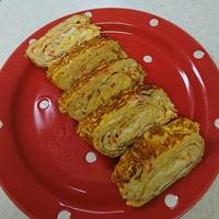 - 4 2の1/2量を流し込みキッチンペーパーで伸ばします。卵が固まってきたら奥から手前へと巻き、奥に寄せ残りのサラダ油をひきます。この工程を同様に2回繰り返し、火から下ろします。