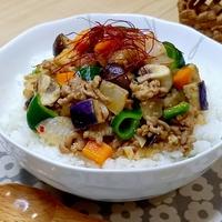 「米ナスとピーマンの肉みそ丼」の作り方を簡単で分かりやすいレシピ動画で紹介しています。